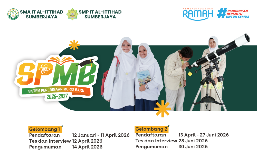 Banyak orang tua bingung harus memilih antara prestasi akademik tinggi atau hafalan dan bacaan al-Qur'an yang kuat, karena itu SMP IT & SMA IT AL-ITTIHAD SUMBERJAYA hadir memadukan kurikulum sains nasional dengan muatan tahsin dan tahfidz al-Quran, agar anak anda tumbuh cerdas secara Intelektual dan tetap mulia bersama al-Quran.